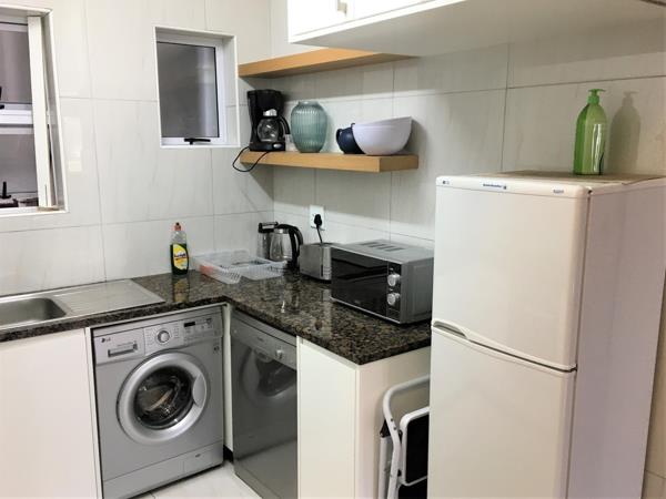 The apartment features 1 bedroom, lounge and Bedroom, an equipped kitchenette with a microwave and a fridge, a washing machine, and 1 bathroom with shower, toilet and basin.