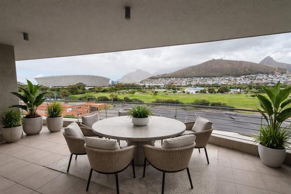 Perfectly positioned, it captures sweeping vistas across the Mouille Point golf course, the stadium, and towards Green Point, all framed by a striking mountain backdrop.