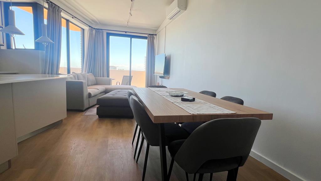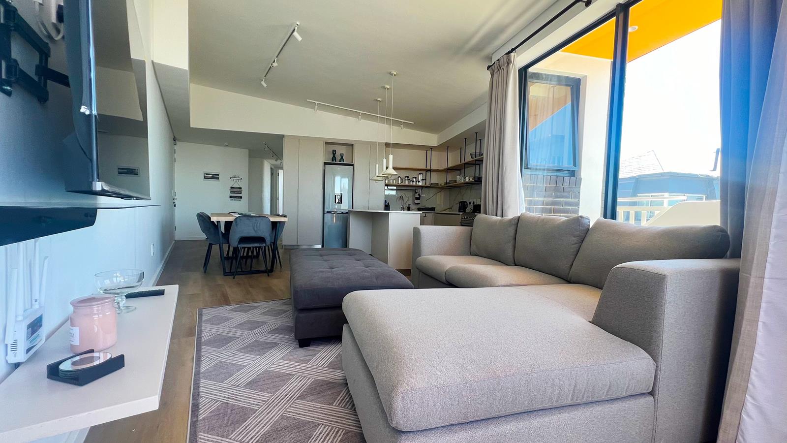 The dining area with a 6 seater table flows into the lounge with a tv and opens onto the balcony with amazing views of the ocean and the city.