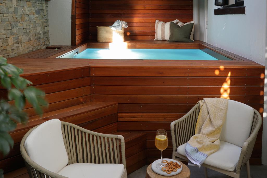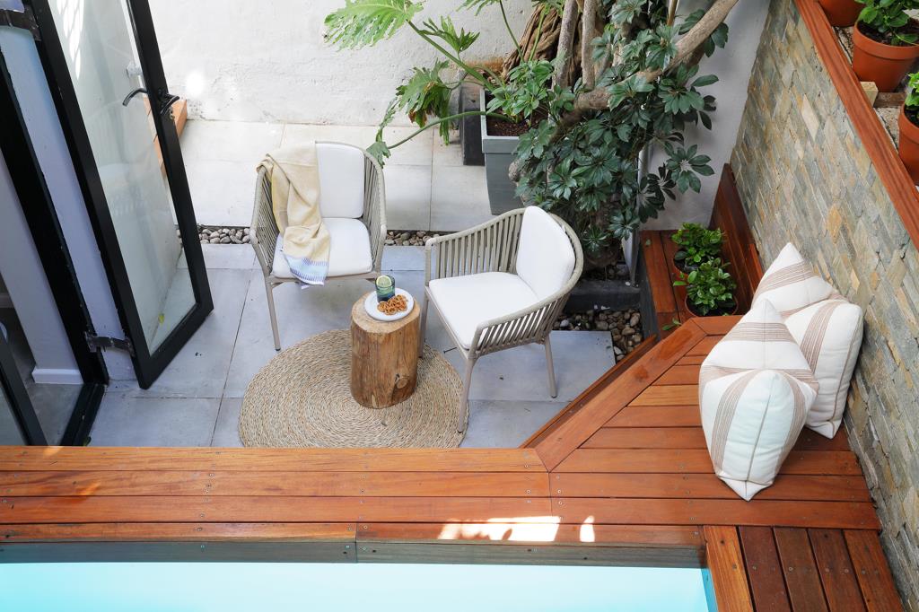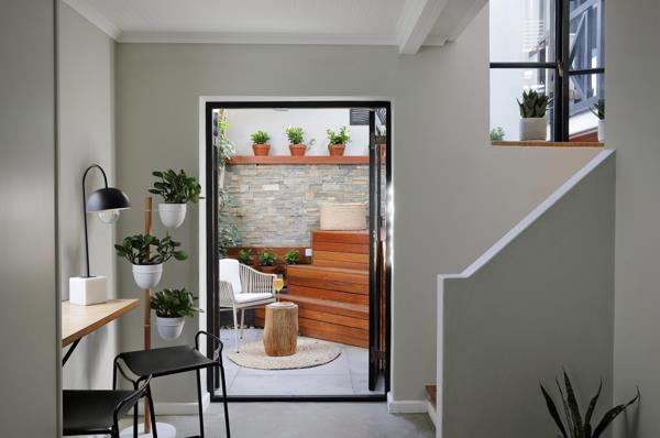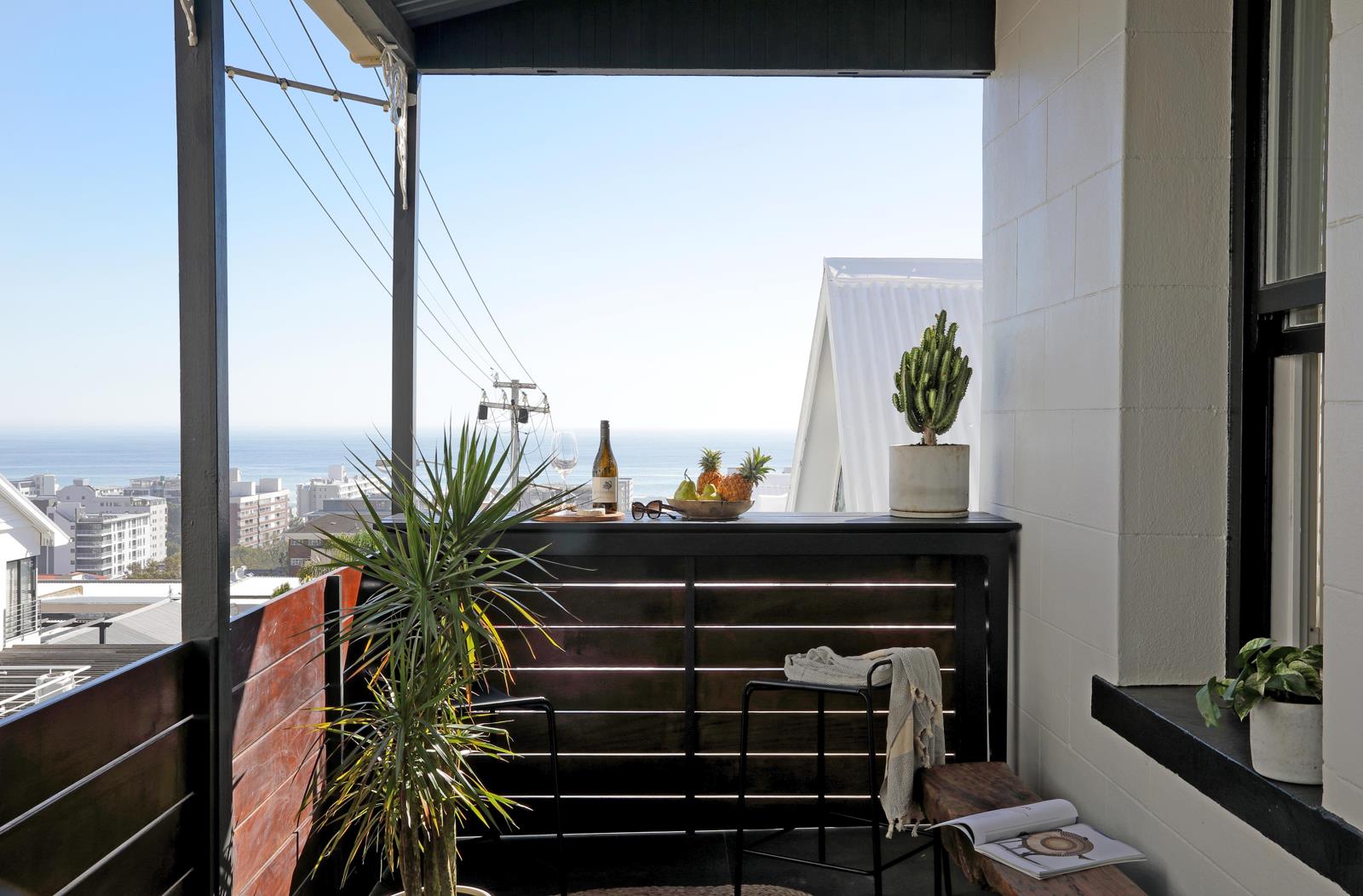A private courtyard with a plunge pool provides a relaxing space to unwind. The front verandah offers views over the surrounding rooftops to the sea, perfect for enjoying morning coffee. The home is within walking distance to the Sea Point Promenade, shops, and restaurants, offering convenience and easy access to local attractions.
