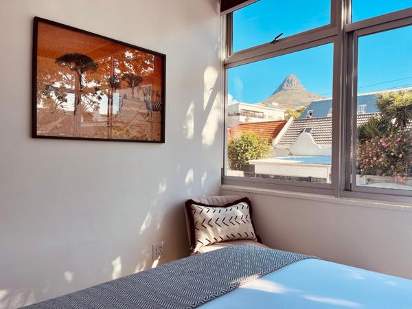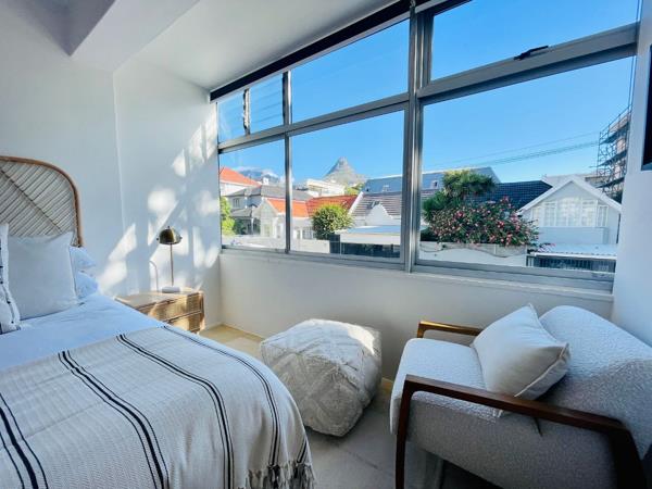 The apartment features three light-filled, generously sized bedrooms, each offering stunning views of Cape Towns Lions Head and Table Mountain. The open-plan living area is airy and inviting, with a partial ocean view and seamless flow to the vibrant surrounding neighbourhood.