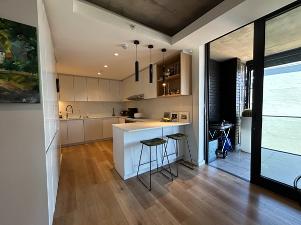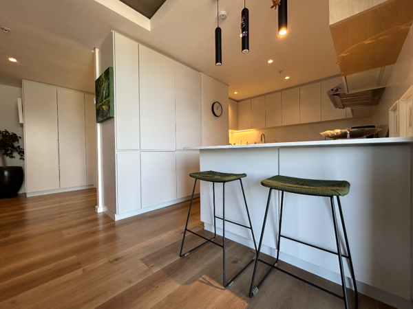 The open-plan kitchen is thoughtfully designed with ample cupboard space and Caesarstone countertops. Integrated appliances, includes a fridge and dishwasher, contribute to a clean and streamlined finish. The kitchen is fitted with a built-in hob, undercounter oven, and extractor.