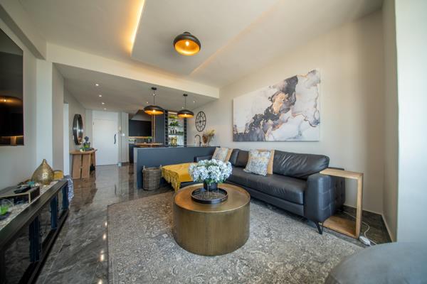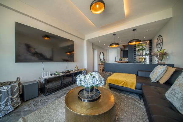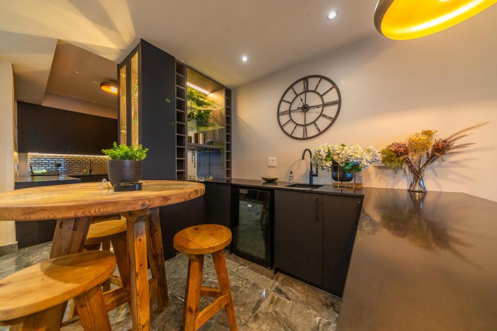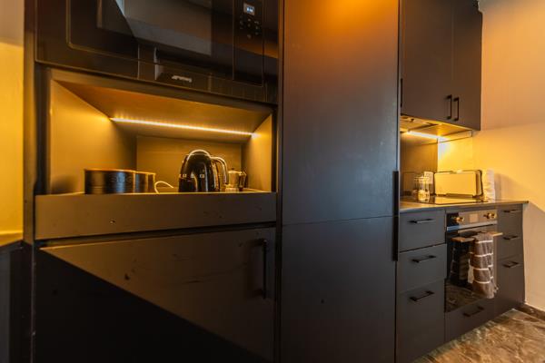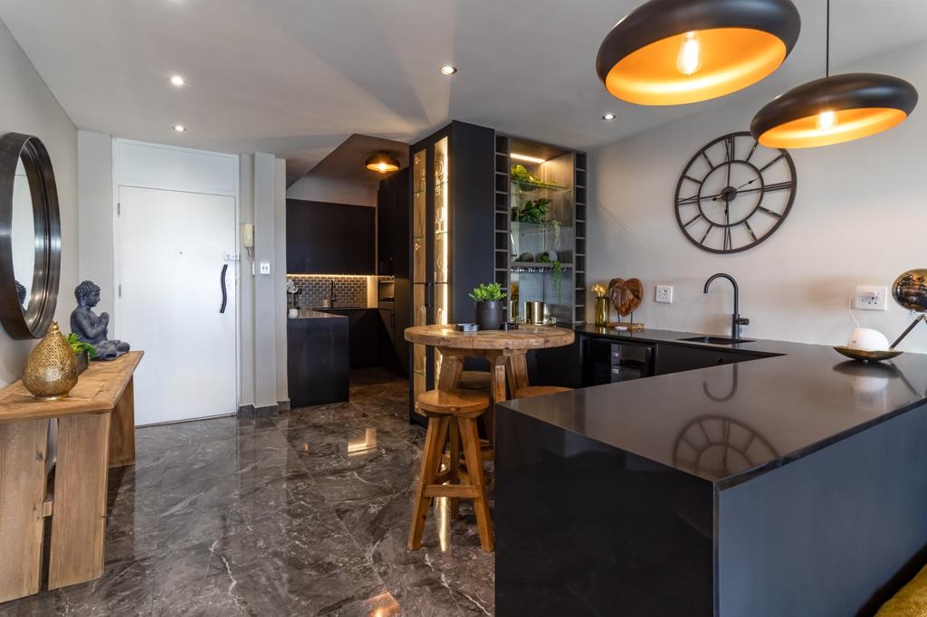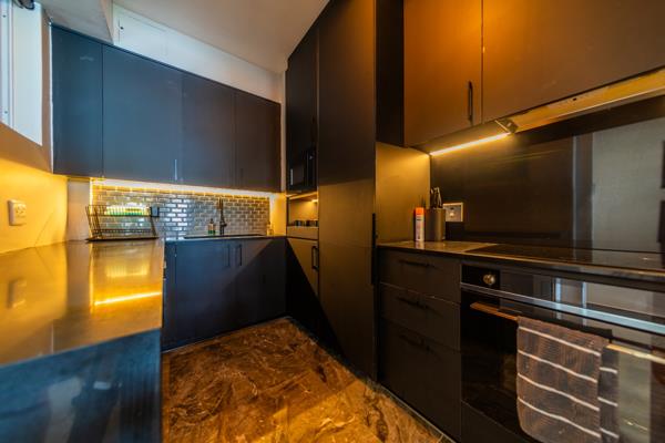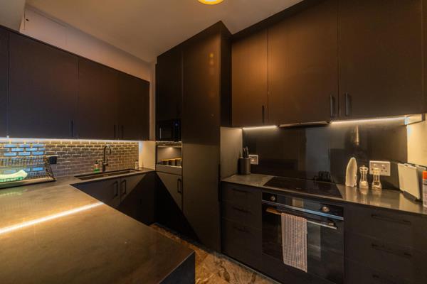 This sophisticated, furnished apartment offers a contemporary living experience in the vibrant coastal suburb of Sea Point, Cape Town. Designed for modern comfort, the open-plan layout seamlessly connects the lounge, dining area, and a sleek kitchen. The kitchen boasts dark, matte cabinetry, marble-look flooring, and integrated appliances including a microwave, oven, and hob. Thoughtful details like under-cabinet lighting and a dedicated bar area with a sink, wine rack, and mini-fridge enhance both functionality and style, making it perfect for entertaining.