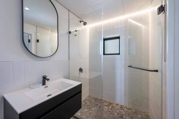 2 Modern bathrooms with shower, basin and toilet