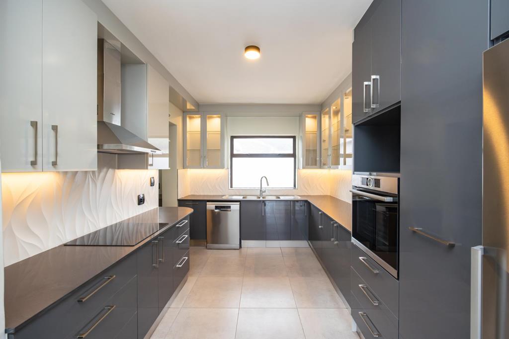 The beautifully modern kitchen consists of an electric stove and raised oven with a brand new dishwasher and fridge. There is a scullery off the kitchen with plumbing for two appliances. There is plenty of cupboard space with mountain views.