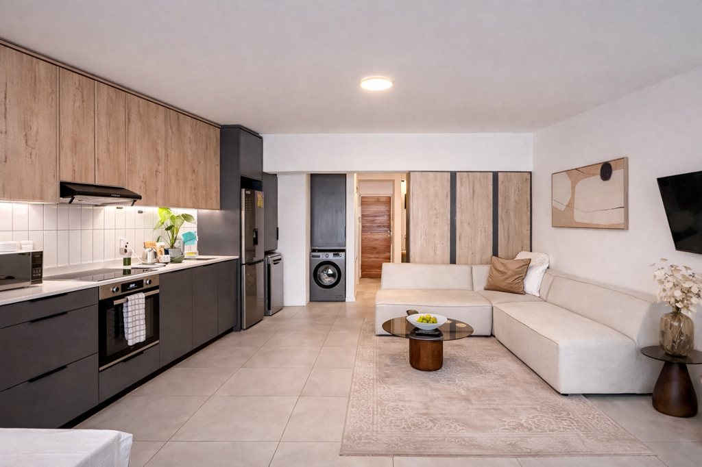 The bedroom area is comfortably integrated into the space, making it ideal for a single professional or someone looking for a low-maintenance coastal base.