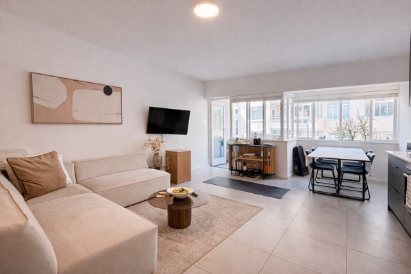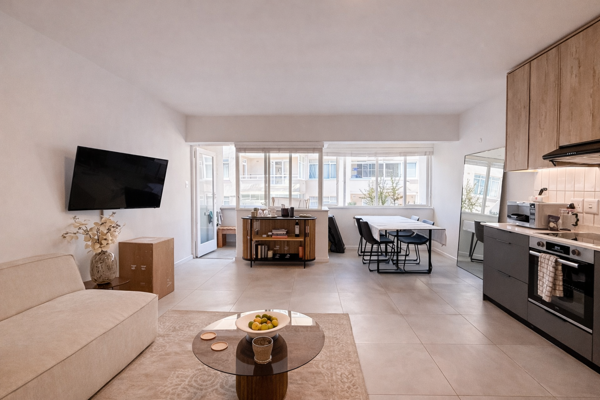 Inside, the apartment has been thoughtfully updated to feel clean and contemporary. The open-plan layout is well-proportioned, allowing for a distinct sleeping area while still maintaining a sense of space. Natural light filters in, enhancing the calm, uncluttered feel throughout.