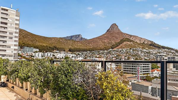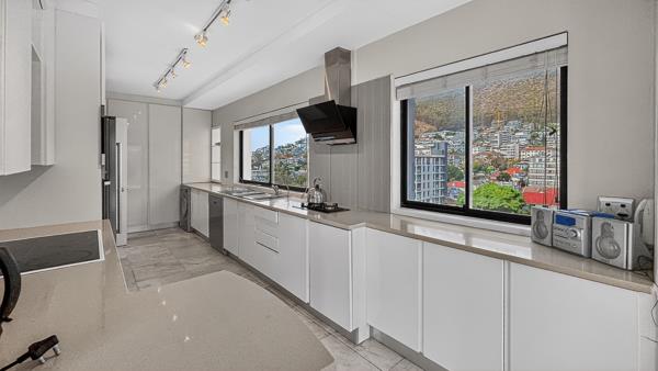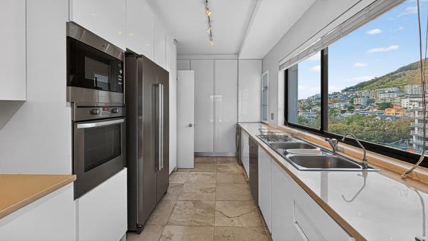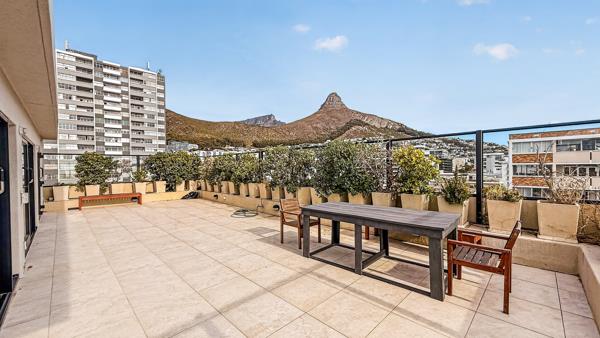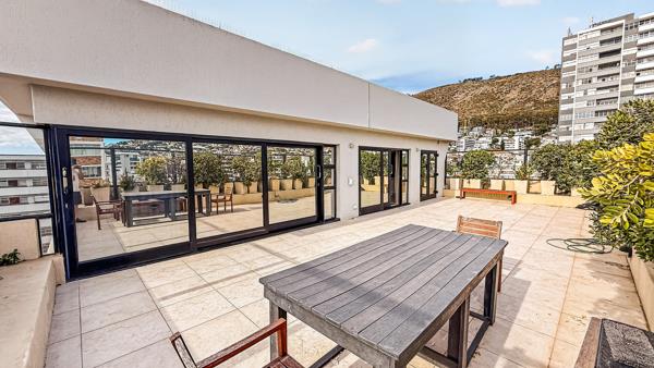 The living area opens effortlessly onto a generous rooftop patio, creating a natural flow between indoor comfort and outdoor entertaining. Large windows frame the surrounding scenery, while the kitchen is positioned to enjoy elevated views across Sea Point, making everyday living feel connected to the landscape.