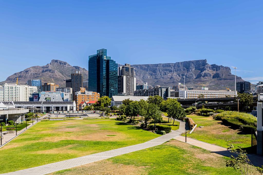 The open-plan kitchen and lounge flow seamlessly onto the balcony, creating an ideal space for both entertaining and everyday living. Expansive windows allow for an abundance of natural light and offer impressive views of Table Mountain and Battery Park.