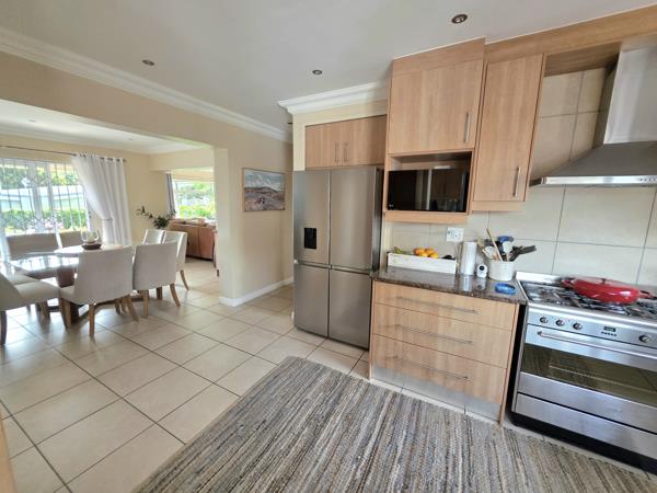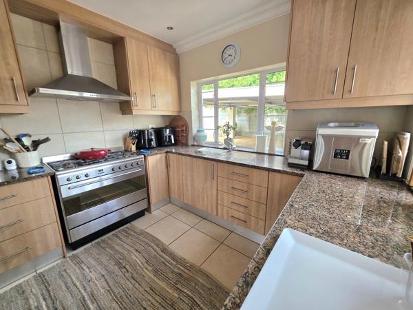 The property is a family haven with tranquil ambiance and lush garden. It boast three comfortable living areas with an open plan flow to the modern kitchen. One of the plus points is the dining room which leads to the beautiful stoep and garden by means of a sliding door. The kitchen is fully fitted with a gas stove with oven, plenty of built-in cupboards and space for a double fridge. The scullery is tucked away and have ample built-in cupboards for all those cleaning materials to be tucked away.