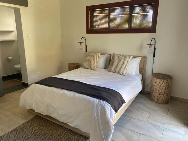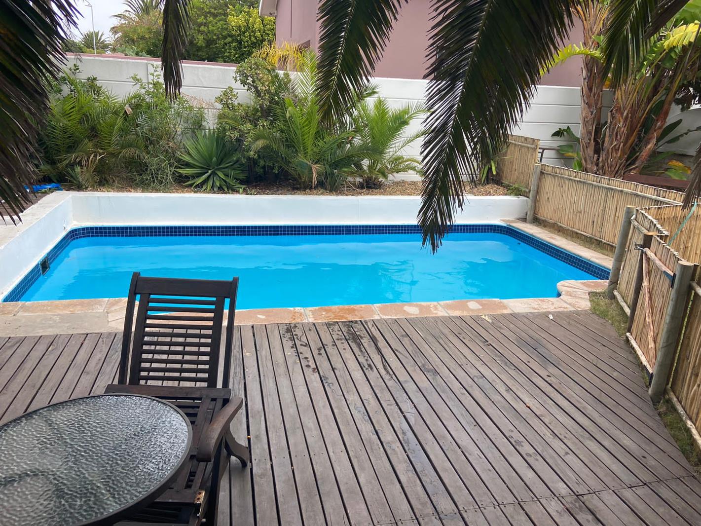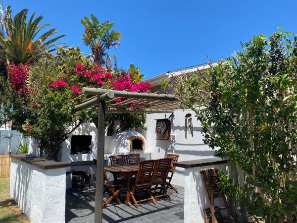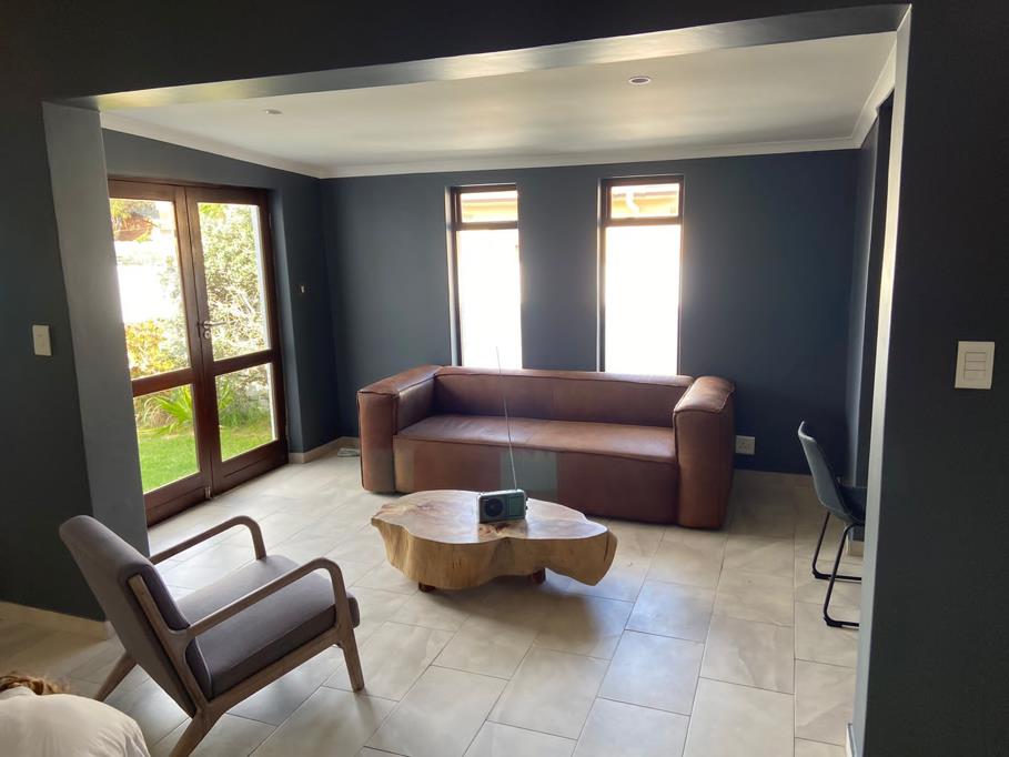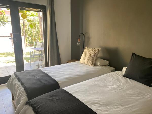 The trendy modern lounge and dining area flows onto a beautiful communal garden, outdoor braai area, pizza oven and swimming pool.