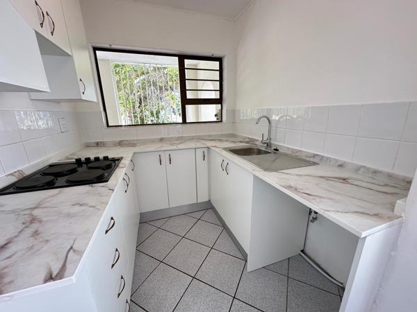 Spacious kitchen with ample built-in cupboards and elegant marble countertops. Plumbed for washing machine.