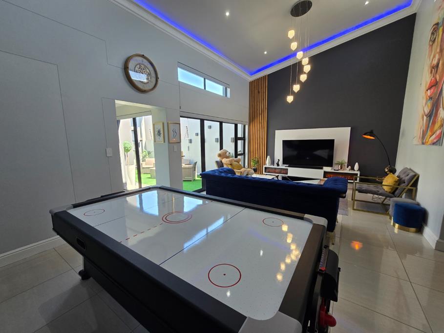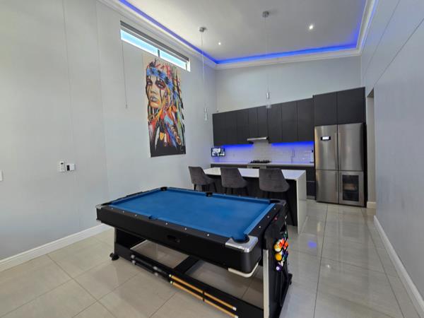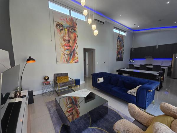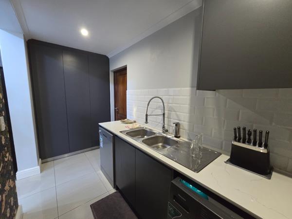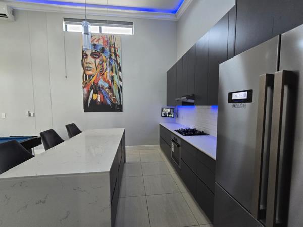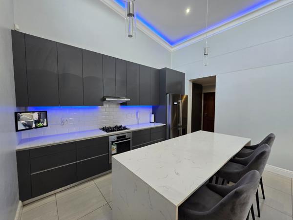 Spacious open plan living area flowing out onto low maintenance garden with braai area. Well fitted open plan kitchen, with stone countertops, gas hob, oven andamp extractor fan. Double door fridge with freezer andamp wine cooler andamp separate scullery with washing machine and dishwasher.
