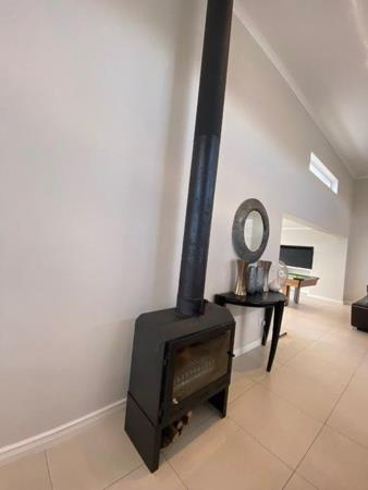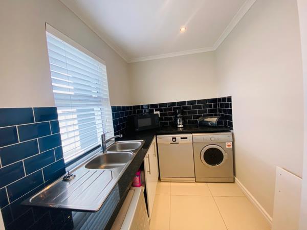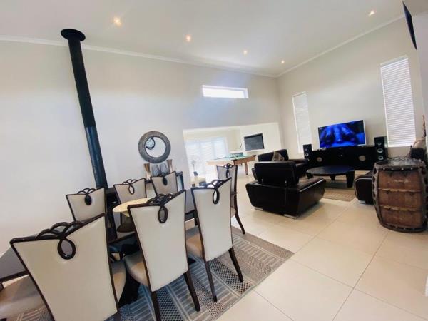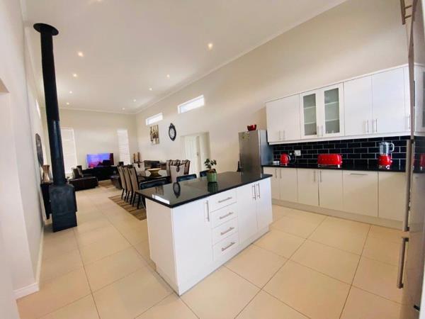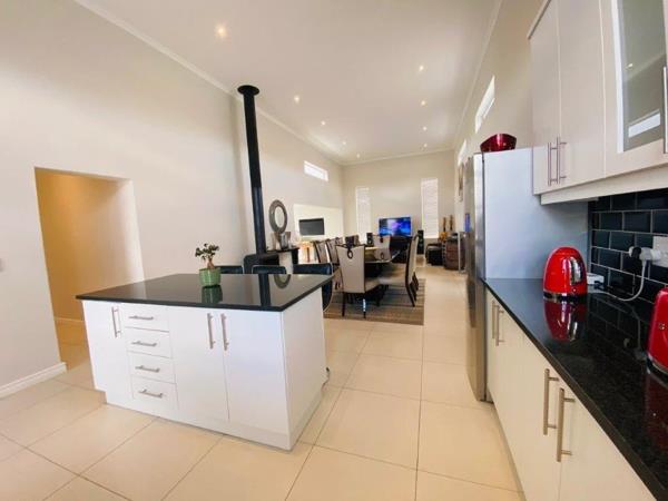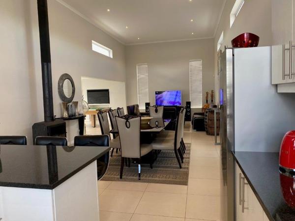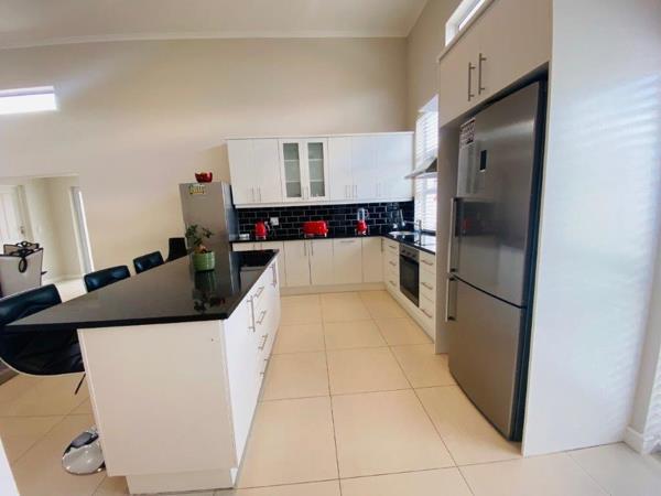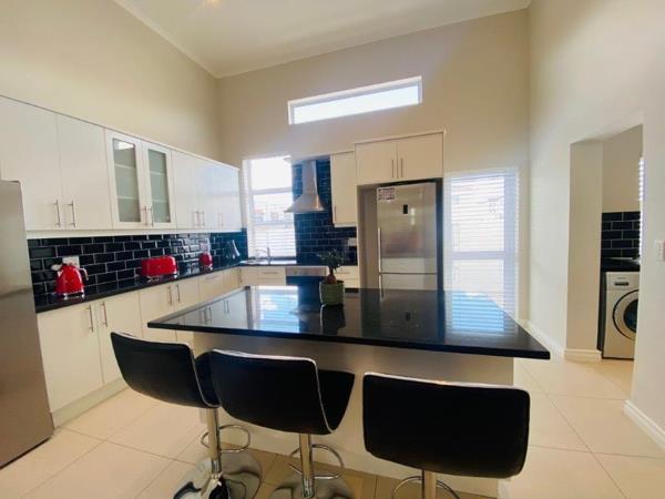 Discover this modern 4-bedroom, 3-bathroom home available for rent in Sandown, Blouberg. The residence features an expansive open-plan layout, seamlessly connecting a contemporary kitchen, dining area, and lounge. The kitchen boasts white cabinetry, dark countertops, a central island, and stainless steel appliances, complemented by a stylish black subway tile backsplash. High ceilings and sleek tiled flooring enhance the spacious feel, with a striking fireplace adding warmth and character. A dedicated laundry area and two garages provide convenience. The property ensures peace of mind with high perimeter walls, an electric fence, and an access gate. Sandown offers a desirable suburban lifestyle in Blouberg.