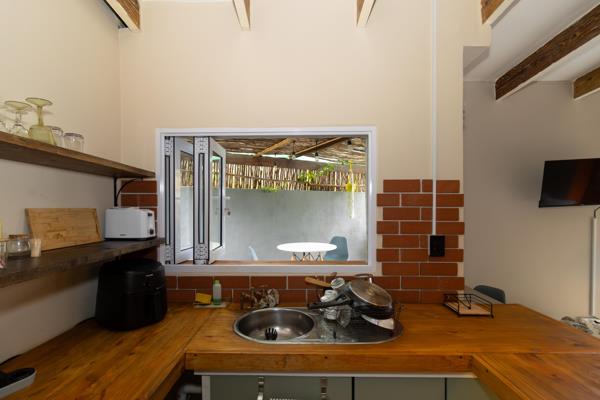 The fully furnished studio is spacious and thoughtfully designed, with stacker doors opening out to a beautiful private outdoor area, creating a seamless indoor-outdoor flow and a light, airy feel throughout the space.