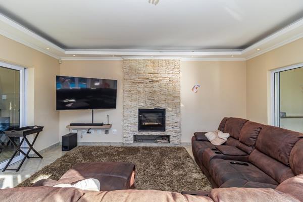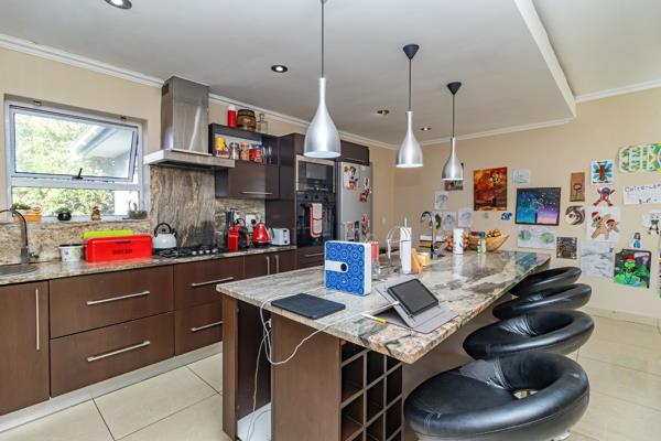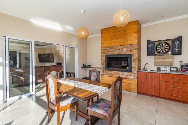 All four bedrooms feature en suite bathrooms, providing privacy and convenience. The open-plan kitchen includes granite tops, a centre island, scullery, and breakfast nook, flowing seamlessly into the living areas. Sliding doors lead to an indoor-outdoor braai area with a built-in braai, perfect for entertaining.