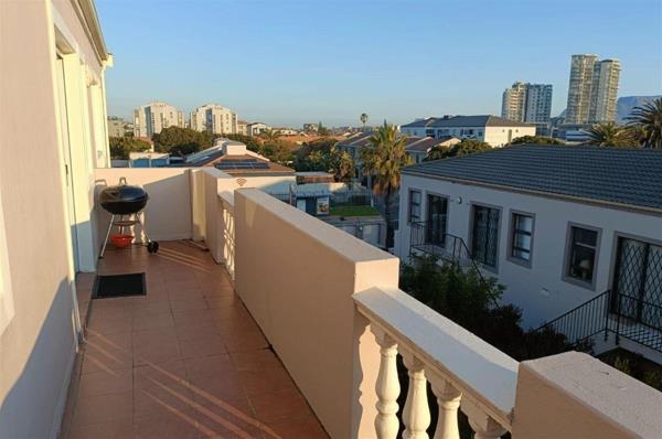 The open-plan layout creates a seamless flow between the kitchen, lounge, and dining areas, leading out onto a private balcony with partial views of Table Mountain.