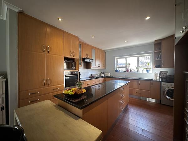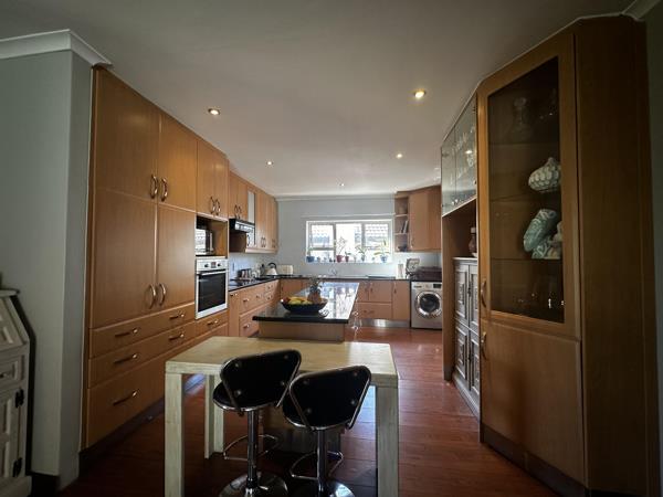 The property comprises 3 bedrooms with built-in cupboards, 3 bathrooms, and a dedicated study, making it ideal for those working from home or for families with home-schooled children. The open-plan kitchen is beautifully finished with marble countertops, offering ample cupboard and counter space, and is further complemented by a separate scullery for added convenience.