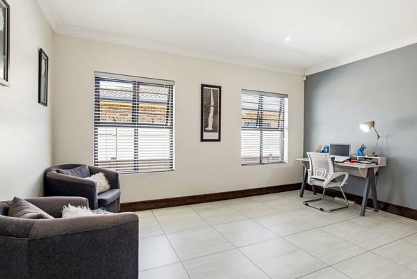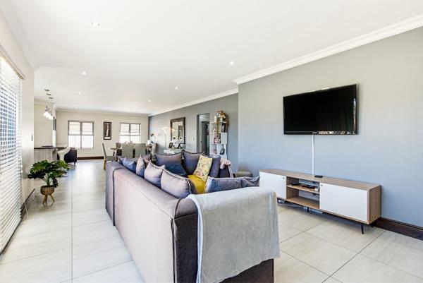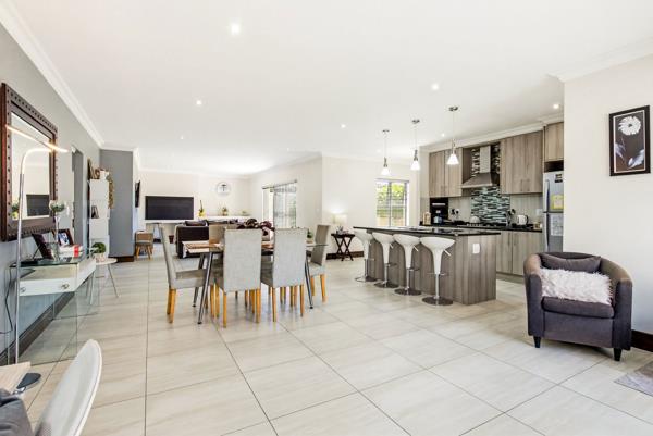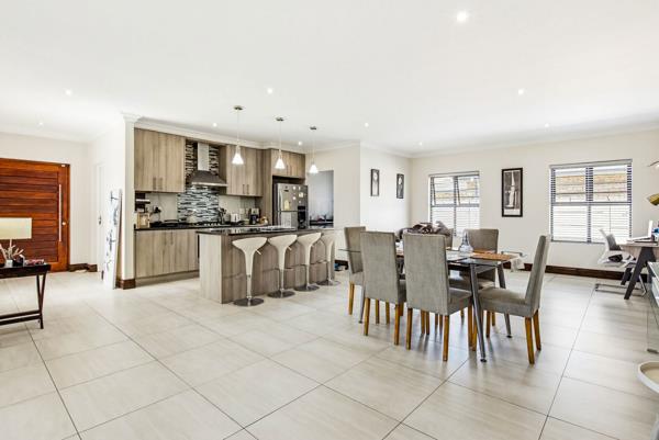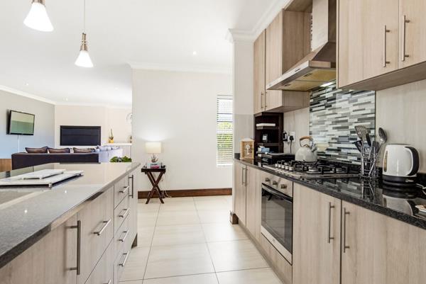 The heart of the home is a light filled open-plan living space that flows seamlessly from the contemporary kitchen into the lounge and dining area. A built-in braai creates the perfect setting for year-round entertaining, while sliding doors open onto the garden, extending the living space outdoors.