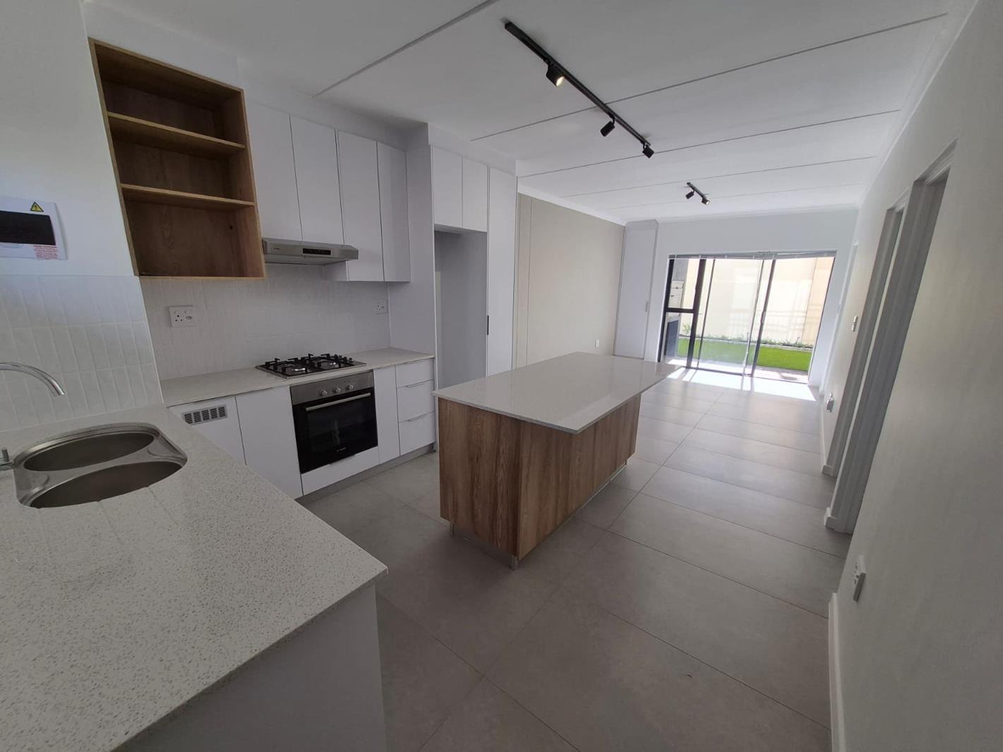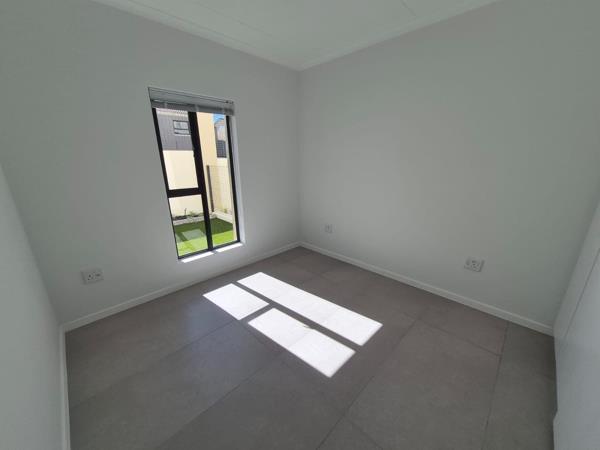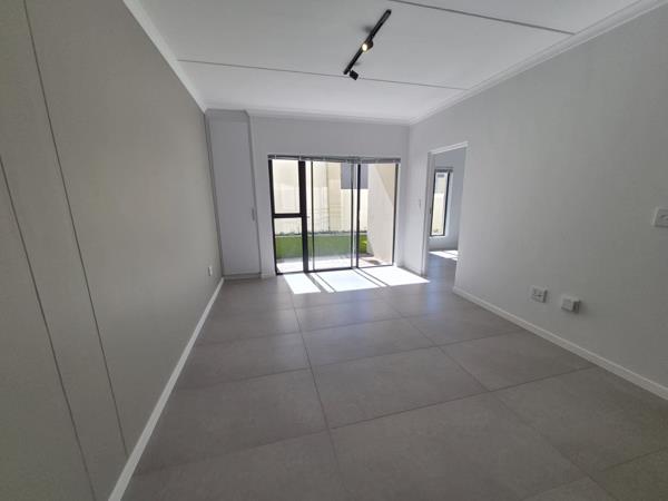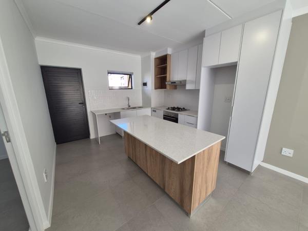 The home features a beautiful open-plan layout, where the modern kitchen flows seamlessly into the lounge area, creating a light and airy living space perfect for everyday living and entertaining. Large doors open up to a private outdoor garden area with a built-in braai, ideal for relaxing weekends and hosting friends and family.