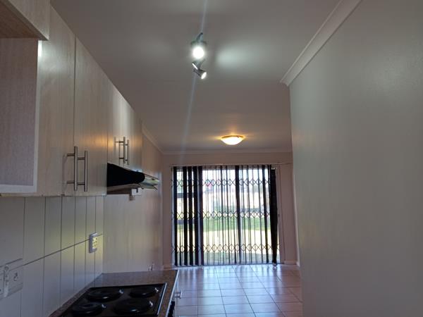 Discover comfortable living in this well-appointed 2-bedroom, 1-bathroom apartment located in the established residential area of Vanguard, Cape Town. The interior features a welcoming lounge and a modern, compact kitchen. This functional kitchen boasts light wood cabinetry, granite-look countertops, an integrated oven and hob, and an extractor fan, all complemented by easy-to-maintain tiled flooring. Ample natural light fills the living spaces, enhanced by large sliding glass doors.