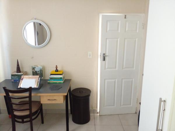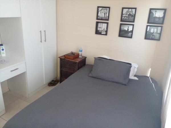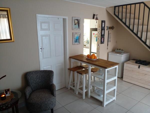 On the ground floor, youll find one standard bedroom no built-in cupboards, a fully tiled lounge, and a fully tiled kitchen fitted with attractive built-in cupboards and a stove.