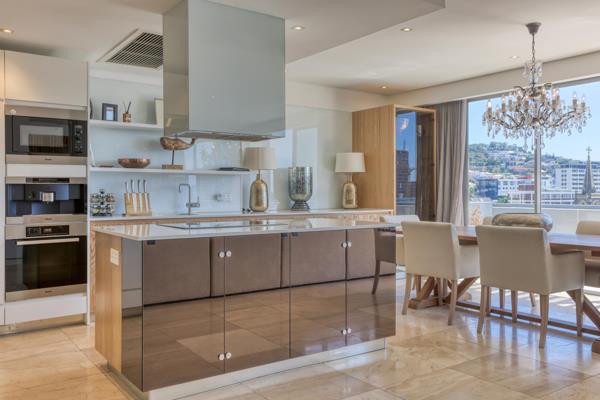The kitchen is fully kitted with a dishwasher, washing machine, dryer, and top-quality Smeg and Miele appliances. The open-plan living area opens onto a balcony with an outdoor table.