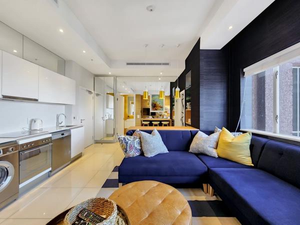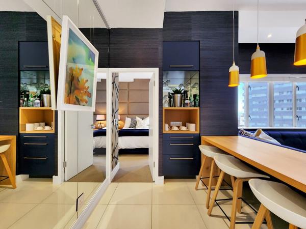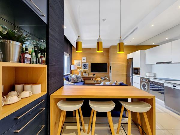 The open plan living room, dining room and galley kitchen has wonderful high ceilings, a wall of windows, feature oak lined walls and spectacular elevated views over the Cape Town cityscape, working V&A Waterfront harbour, Walmer Estate and Woodstock. The modern kitchen is equipped with integrated SMEG oven and hob, microwave, washing machine & dishwasher, and has high glass bright white cabinetry and Ceasarstone worksurfaces adding to the overall seamless design and luxury feel. The dining room enjoys an integrated bar, perfect for a night cap.