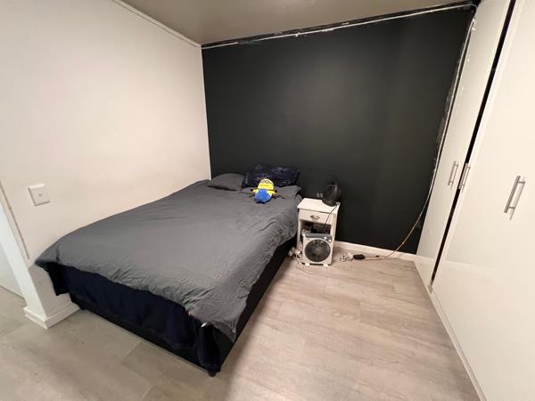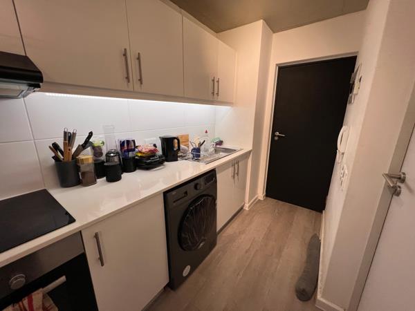This fully furnished apartment features one bedroom with a comfortable double bed, a bathroom with a shower, toilet, and basin, and a fully equipped kitchen including a fridge and washing machine. The living room is furnished with a couch and TV, and the dining area includes a table and chairs. The apartment also includes one basement parking bay and a biometric facial security system for added safety.