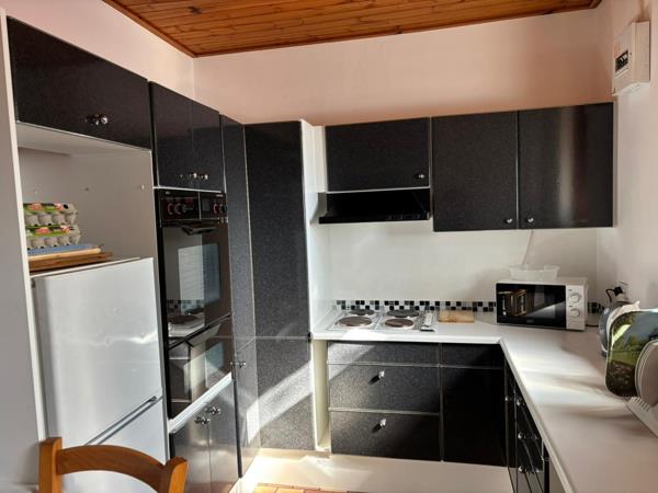 The kitchen with built in cupboards, a HOB, extractor fan, oven, washing machine and fridge