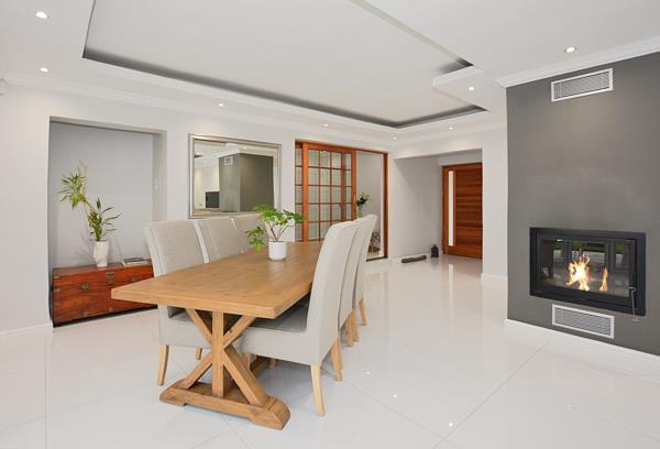Heading into the home you have an open plan dining area and lounge with a fitted fireplace.