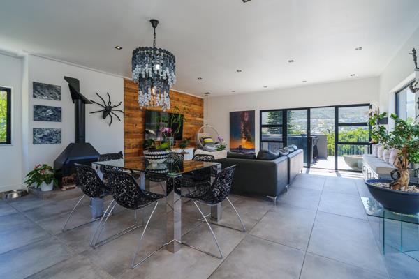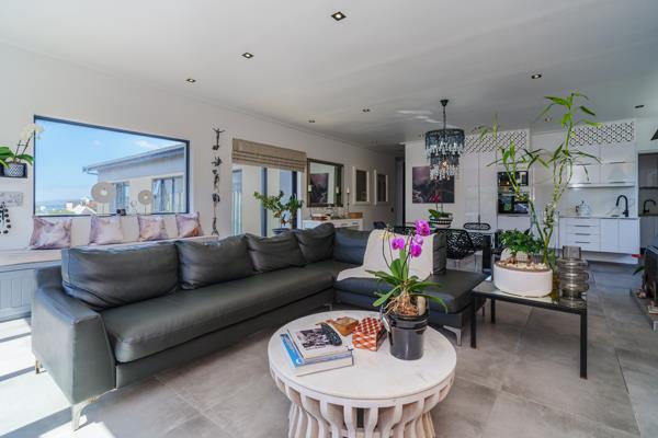Sunlight pours through large windows, illuminating the space and highlighting the seamless flow onto a deck with a built-in braai, where you can soak in breathtaking ocean and mountain views. A private plunge pool adds a serene touch to this exceptional home.
