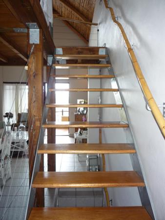 Stairs to carpeted mezzanine level bedroom