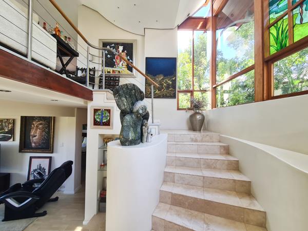 The master suite is situated upstairs which has space for a small study/work space. Light and bright bedroom with open plan bath and shower (separate loo). Plenty built in cupboards and a private balcony offering lovely views.