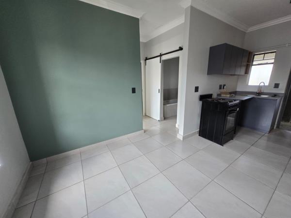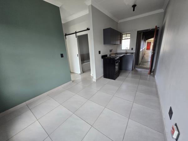 The interior boasts a fresh, clean aesthetic with light-coloured tiled flooring throughout and freshly painted walls, including a tasteful sage green accent wall that adds character. The open-plan layout seamlessly connects the living spaces. The modern kitchen is a highlight, featuring sleek grey cabinetry, a light grey countertop, a single-basin sink, and a freestanding electric stoveoven. Natural light streams in through the kitchen window, creating a bright and inviting atmosphere. A stylish barn-style sliding door leads to the well-appointed bathroom, enhancing the modern design.