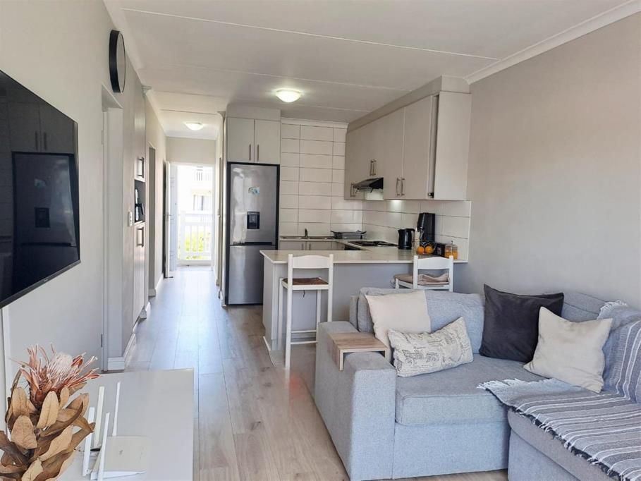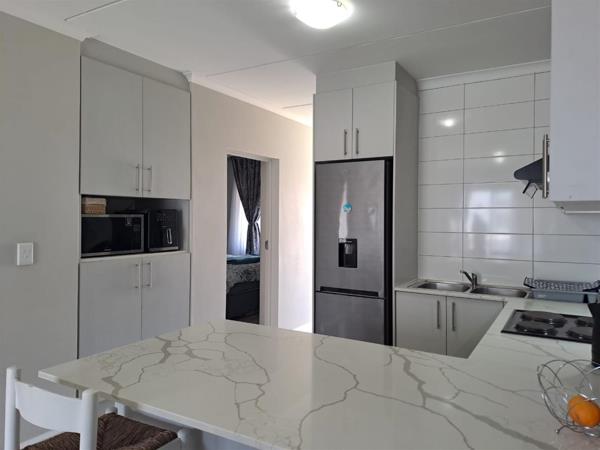 The apartment features an open-plan kitchen and living area that flows seamlessly onto a private balcony with a built-in braai perfect for relaxing or entertaining. The kitchen offers sleek finishes, ample cupboard space, and modern fittings. Both bedrooms are well-sized with built-in cupboards. A full bathroom and separate guest toilet add extra convenience.
