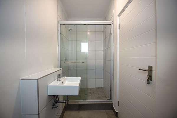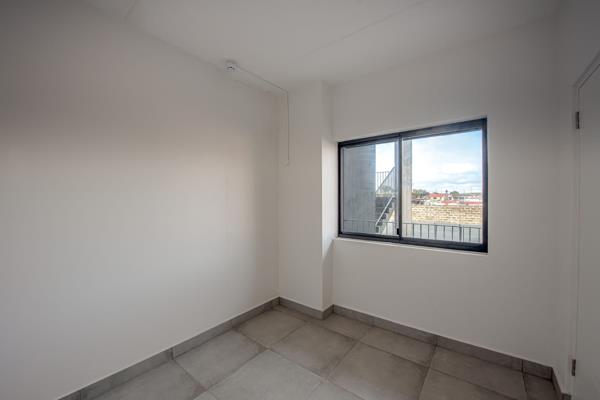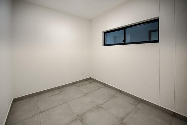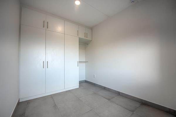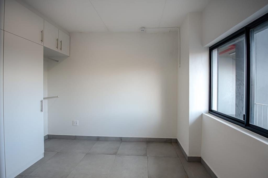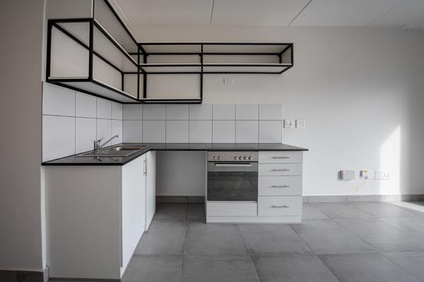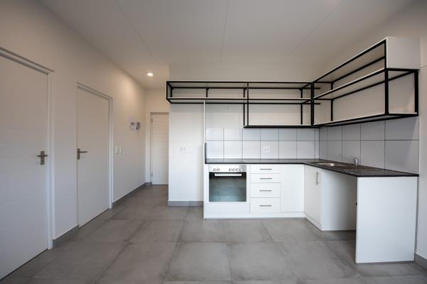 The open-plan living and dining area flows seamlessly into a modern kitchen fitted with ample cupboard space and quality finishes. The spacious bedroom features built-in cupboards and plenty of natural light, while the bathroom is neat and contemporary.