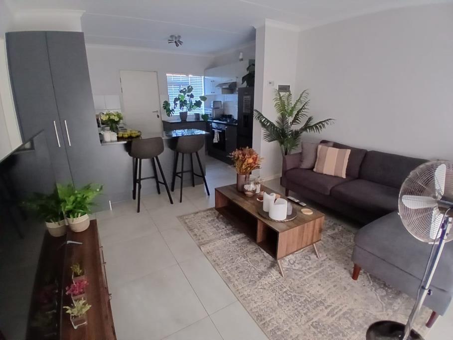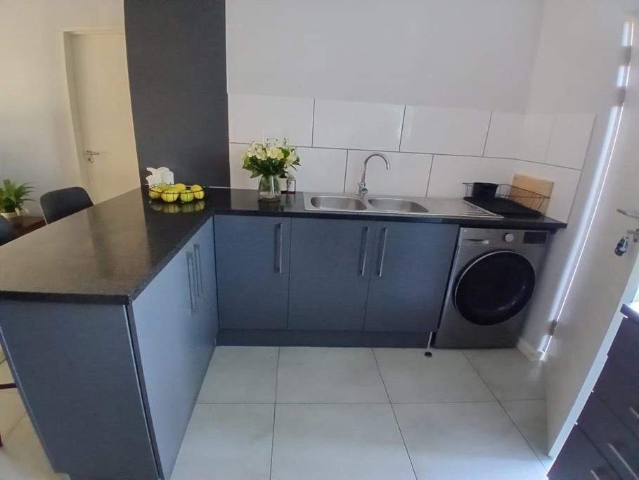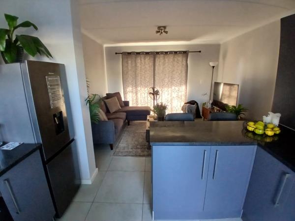 Open plan kitchen gas hob and living area with a good amount of cupboard space. The private patio includes a built-in-braai.