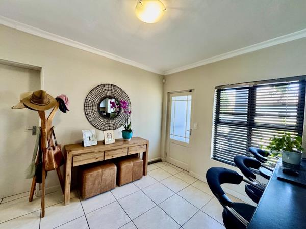 The dining room and living room area is spacious, features an aircon and has a glass sliding door leading you outside to the garden area with abuilt-in braai, bamboo roof area, bamboo screen for privacy and roller blind screen for the winter monthswindydays. The garden wraps around andfeaturesan Astro turf lawn and pavers and stones plus a retractable washing line.