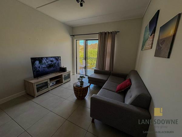 The apartment boasts an open-plan Scandinavian-style kitchen with engineered stone countertops, a ceramic Defy hob, and an electric oven, alongside eco-friendly appliances including an integrated fridge, washing machine, and dishwasher. This kitchen flows seamlessly into a spacious lounge that extends onto an outdoor balcony. The fully tiled bedroom offers ample cupboard space, complemented by an en-suite bathroom featuring a shower, toilet, and basin with modern finishes.