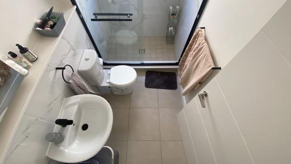 Stylish Sanctuary: The well-sized bathroom features modern finishes, including a sleek shower, toilet, and basin.