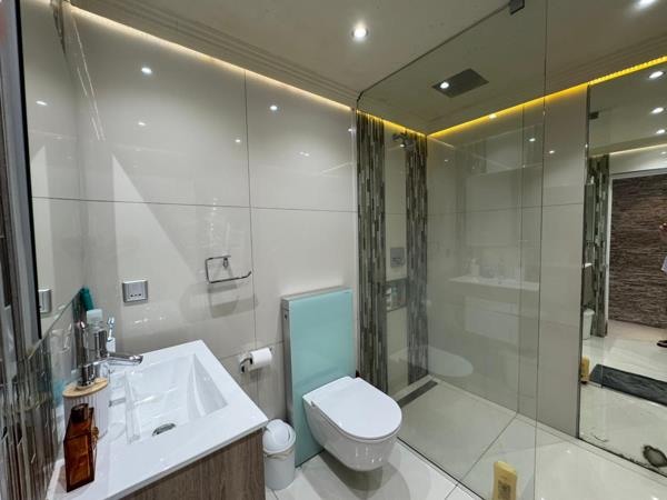Renovated bathroom consisting of a large walk-in-shower an overhead Hansgrohe rainfall showerhead mounted into the ceiling, as well as a wall-mounted sports showerhead with three pulsepressure settings, The shower mixer has a 2 button touch control sensor, thermostatic control to ensure the water temperature plus heated towel rail oil-filled heated rail and low electric consumption to ensure towels are always dry and warm after showering, quality gerbera towel installed with quality Laufer toilet bowel, a Hansgrohe touch basin tap and an Italtile designer bathroom console.