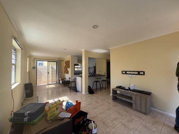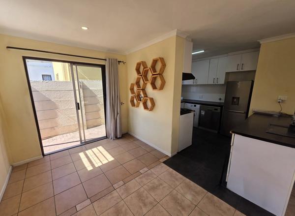 Upon entering, you are greeted by an open plan living and dining area that provides a warm, connected atmosphere for daily life and entertaining. A fully fitted and functional kitchen is located adjacent to the dining area. The ground floor offers a convenient layout featuring a large, carpeted bedroom with built-in cupboards, serviced by a small, separate bathroom off the passage.