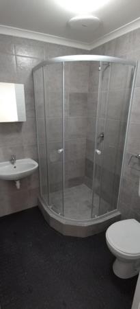 Fully tiled bathroom with shower, basin and toilet.