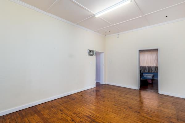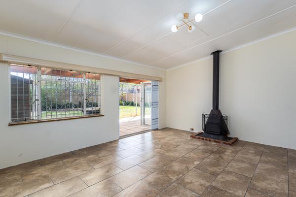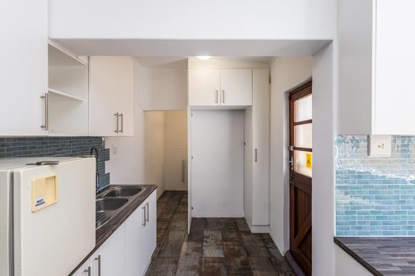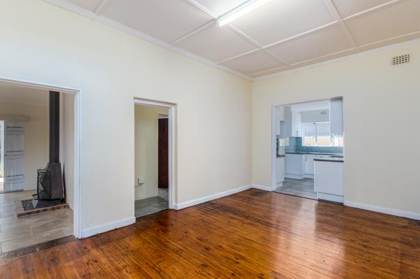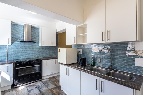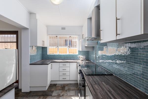 Step into a cosy entrance hall with high ceilings, leading to three spacious bedrooms, two with built-in cupboards and beautiful wooden floors. The light filled dining area flows into a modern, renovated kitchen with ample cupboard space and a separate scullery.