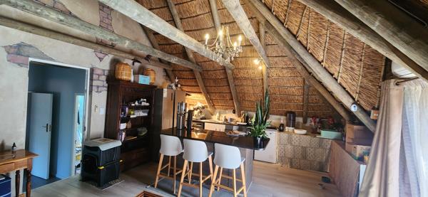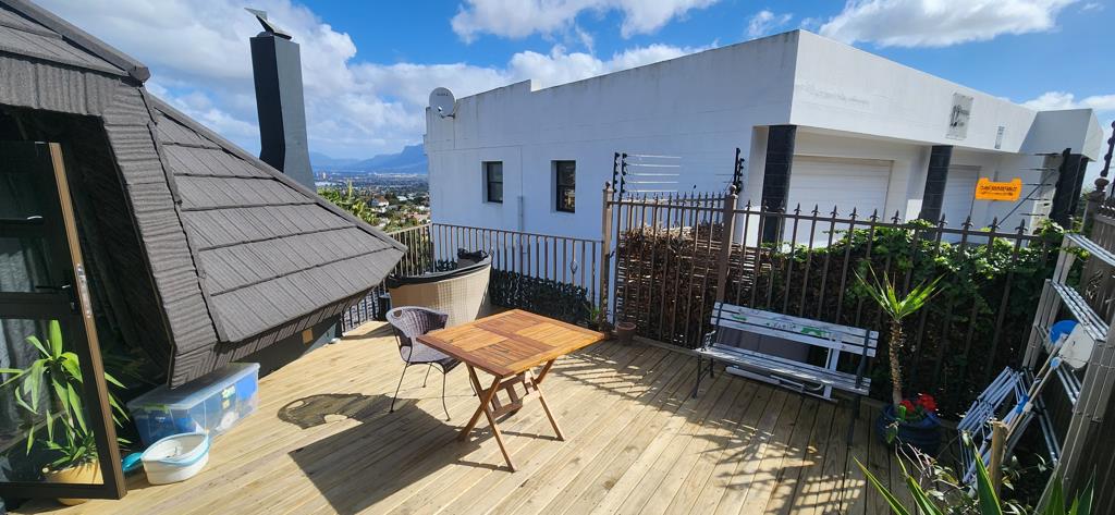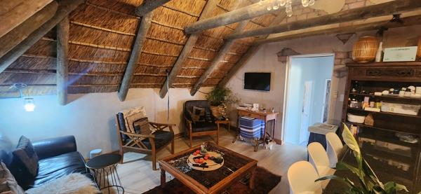 The private entrance is complete with a beautiful sunny deck area with breathtaking views of Table Mountain. The open plan living and kitchen area has a beautiful thatch roof and leads to the bedrooms and bathroom.