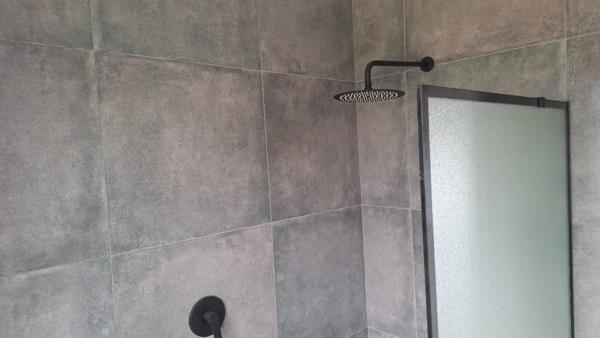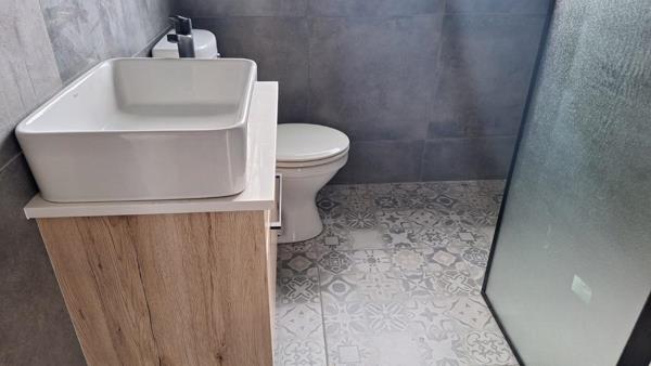 The bathroom is newly refreshed with a modern hand basin, toilet, and a walk-in shower for a crisp, contemporary feel.
