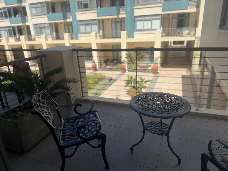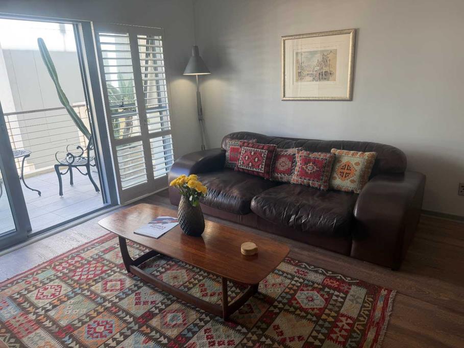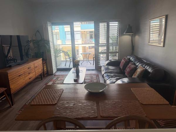 Open plan loungedining, doors leading to balcony with view of the courtyard.