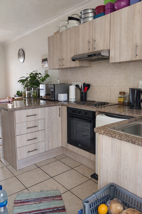 The apartment features a bright open-plan kitchen and living area designed for easy living. The kitchen is fitted with built-in cupboards, oven and hob, and ample counter space, making it both practical and functional.