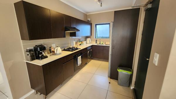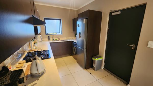 Modern kitchen with Ceasarstone counter tops, built-in cupboards, oven with 4 burner gas hob, fridge freezer, washing machine and tumble dryer.